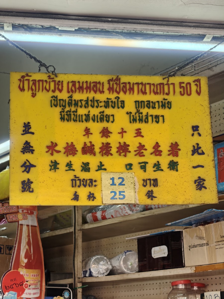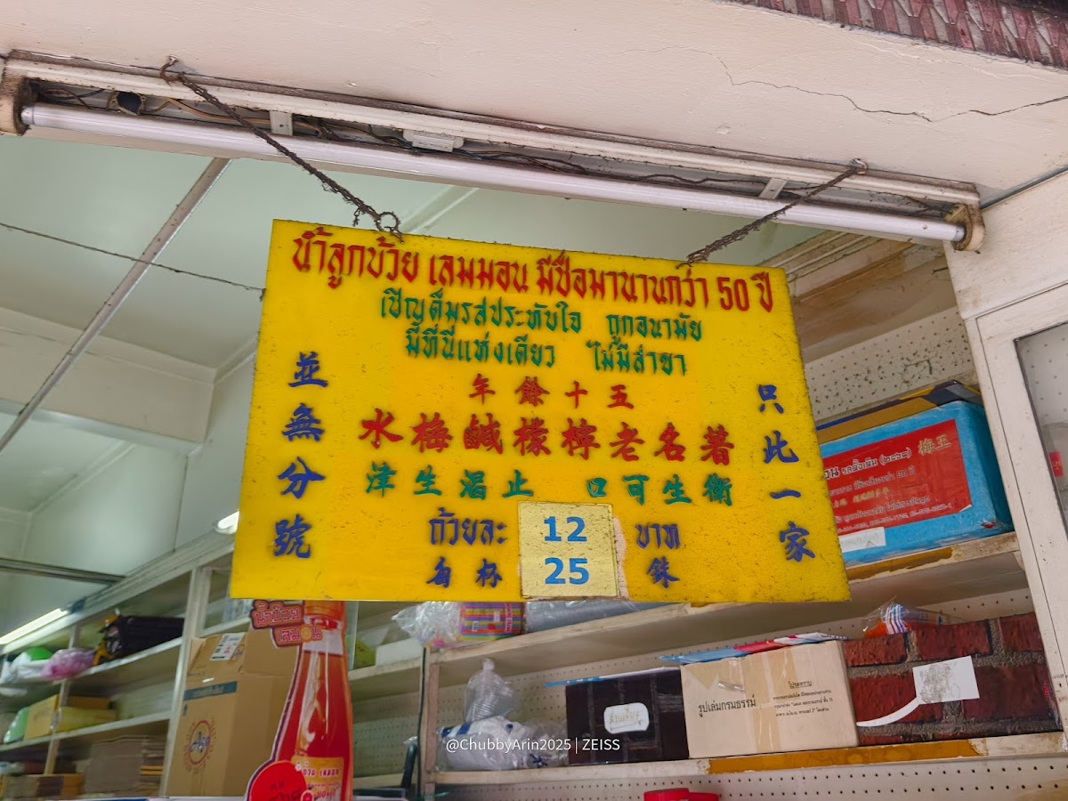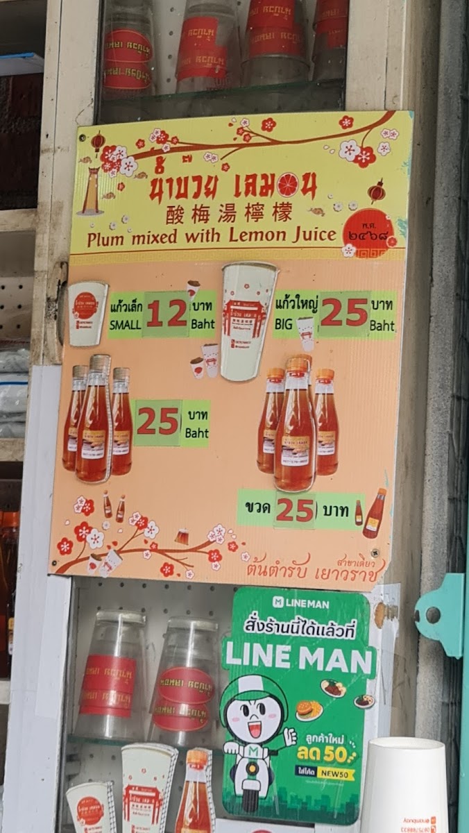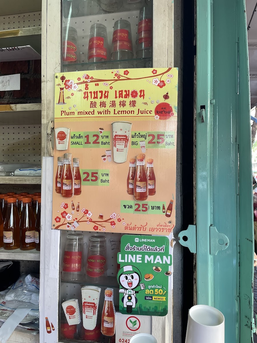 Priced affordably at 12 baht for a small and 25 baht for a large, the plum lemon juice is ideal for a quick thirst quencher without feeling heavy. Customers rave about its authentic flavor and versatility, with some even adding soda or fresh lime to personalize their drink. The shop also sells bottled juice and traditional salted pickles, enhancing the local experience. For anyone wandering Chinatown, Plum Lemon Juice is a must-try: a simple, expertly crafted delight that refreshes and revitalizes with every sip.